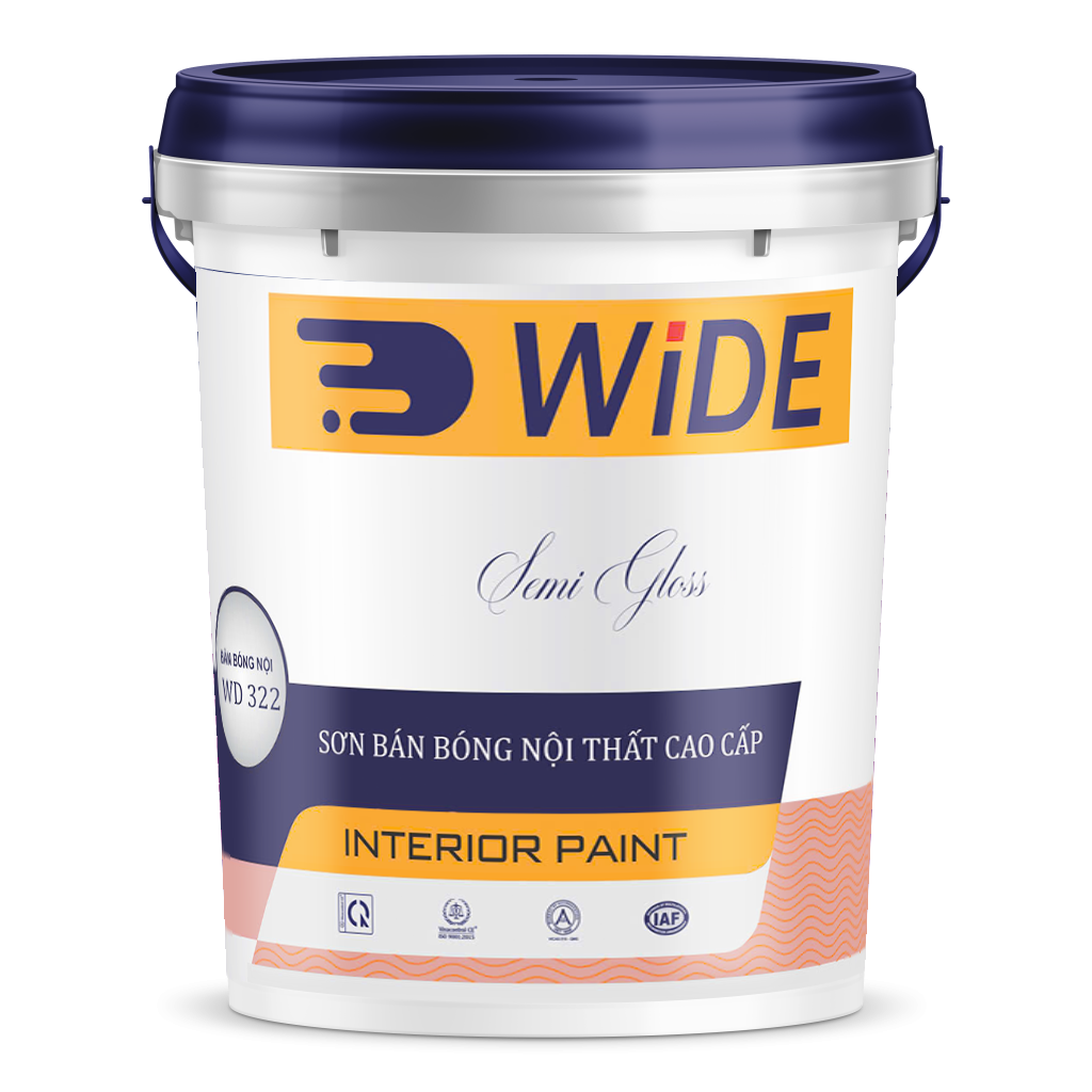 Sơn bán bóng nội thất cao cấp WD322 là loại sơn hệ Acrylic phủ trong nhà, đã hoàn toàn nhiệt đới hóa, rất phù hợp với khí hậu nóng ẩm của Việt Nam. Dùng để sơn phủ trang trí trong nhà, sau khi đã làm phẳng tường bằng mastic Wide (dẻo/bột). Có thể lăn trực tiếp khi tường đã kho và được lót bằng sơn lót kháng kiềm hoặc một loại sơn trắng trong nhà của Wide.